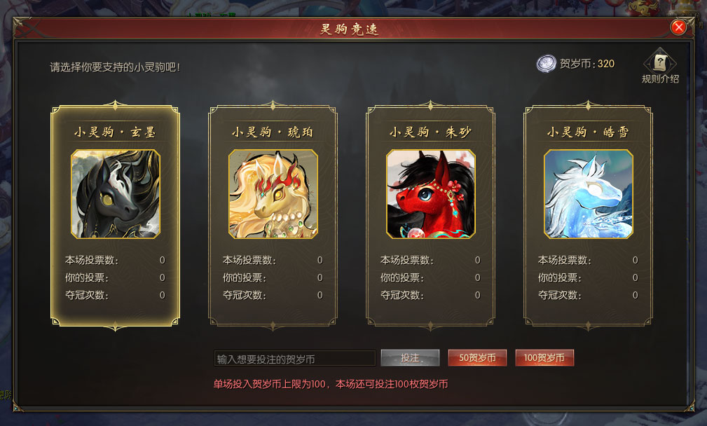 阁下可同时为多只灵驹投票,但每场比赛每位勇士最多只能投出100票。比赛结束时,所有在本场比赛中投票支持冠军的勇士,可根据自己投票占冠军总票数的比例,获得对应数量的花洲贺岁币·午马【绑】。