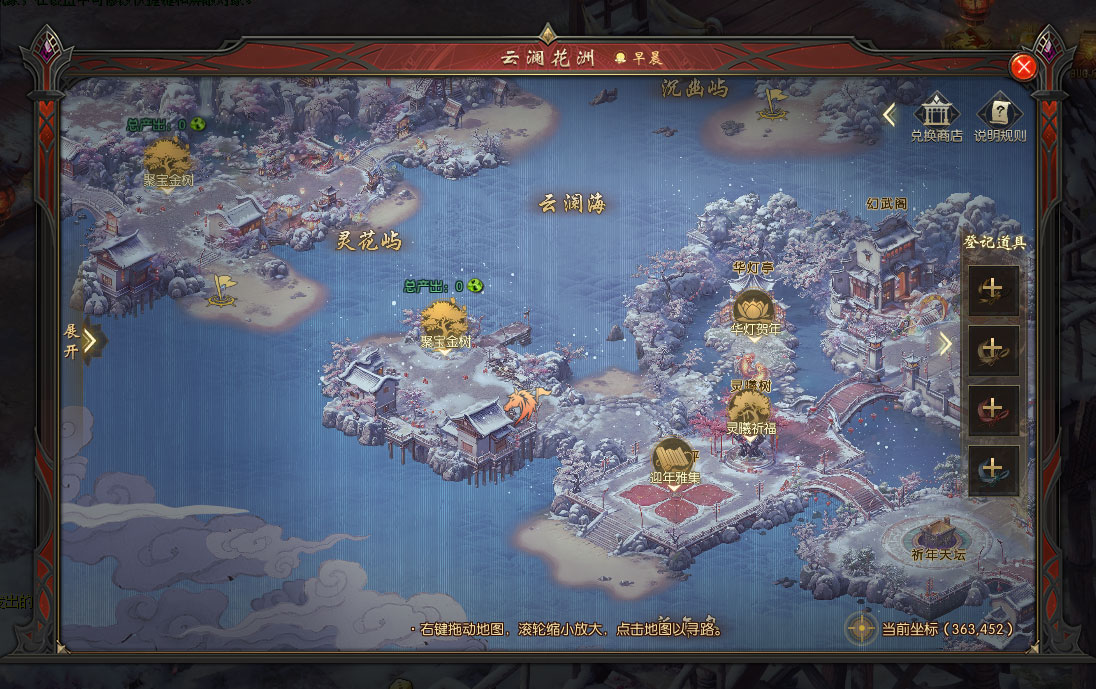 云澜花洲历史悠久,古时曾有年兽将珍玩秘宝埋于地底珍藏,以期永存。在祈年节期间,使用“瑞兽符箓”即可探寻这些神秘的珍宝!