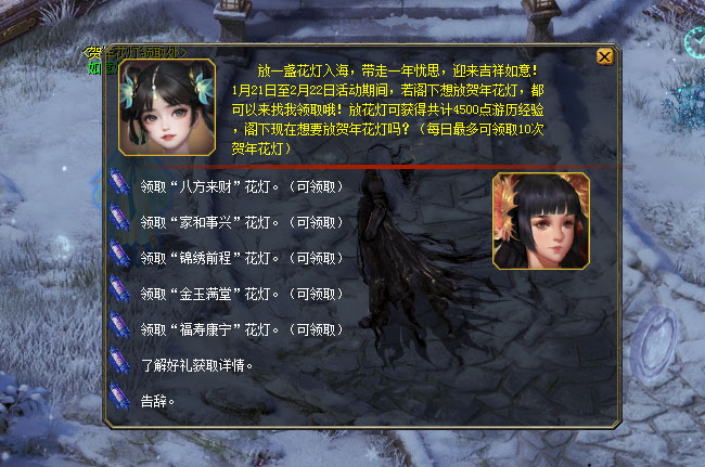 从活动开始,每隔3天,你都可以获得一次领奖次数。在拥有领奖次数的情况下燃放花灯,即可获得游历经验奖励哦。
