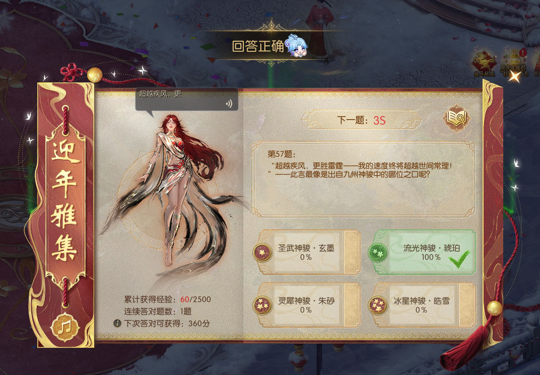连续答题正确的数量越高,获得的游历经验也越丰厚,而若是不慎答错,则需要从头开始累积连续回答正确的计数。