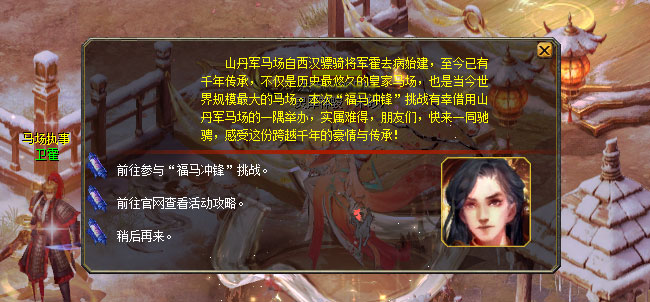 活动期间,前往云澜花洲寻找马场执事卫霍报名即可参与挑战。选择马场上任意1处冲锋起点后,可选择使用的马匹与冲锋技能。