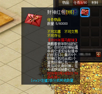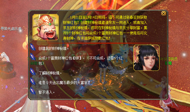 1、活动期间,勇士们可前往卡诺萨城,在新春财神处创建财神秘境,并邀请亲友们一同进入。 2、身处财神秘境中的勇士可以委托新春财神,帮你把要分享的魔石随机分配到魔石宝盒中,然后抛撒在地面,以供到场的亲友分享。 3、勇士还可委托新春财神,派发从“瑞马贺年礼盒”中获得的财神红包,红包中蕴含大量新魔石,供亲友们分享。 4、集齐5个财神红包可合成1个富贵财神红包——使用后可化身财神,在卡诺萨城(市场区、广场区)抛撒红包! |