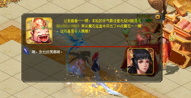 进入财神秘境后,你又看见了新春财神,他笑眯眯地看着你,似乎是在询问你要不要和朋友们一起分享财富。 新春财神告诉你,他可以帮你将魔石都藏入魔石宝盒中,抛撒在地面上,供你的亲友们分享。 你可以在新春财神处探明,是哪位亲友从魔石宝盒中获得了最多的魔石。快看看本轮的“手气最佳”是谁吧?
