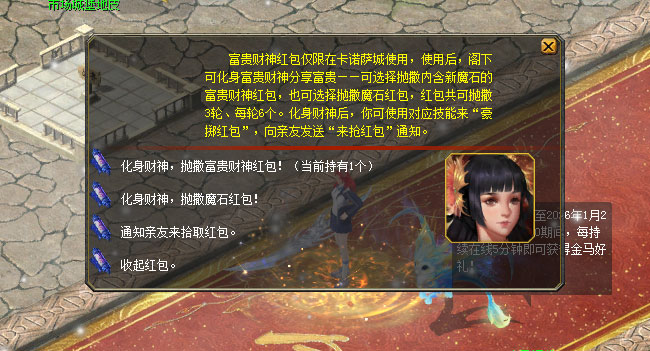 集齐5个财神红包可合成1个富贵财神红包。富贵财神红包仅限在卡诺萨城(市场区、广场区)使用,使用后,阁下可化身富贵财神分享富贵——可选择抛撒内含新魔石的富贵财神红包,也可选择抛撒魔石红包,红包共可抛撒3轮、每轮6个。