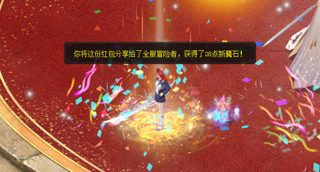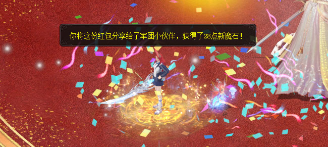 红包虽好但也不要太贪心哦,你每日最多在每位“红包使者”处领取1次拜年红包,即使有几日忘记领取红包也没关系——红包使者将为勇士们保留最多3天内未领取的红包,因此每人每日最多可获得9个拜年红包。 红包使者们的贺岁红包分为新岁小红包、军团情谊红包和全民同乐红包三种—— 活动期间,打开新岁小红包,即可以获得一定数量的星石。打开军团情谊红包或全民同乐红包,可获得新魔石好礼,并将含有星石的红包分享给军团伙伴或全服勇士。 有军团的勇士还能从军团伙伴分享的军团情谊红包中获得好礼,全服冒险者都能领取他人分享的全民同乐红包中的好礼! 注:怀旧服的贺岁红包仅有新魔石奖励。
