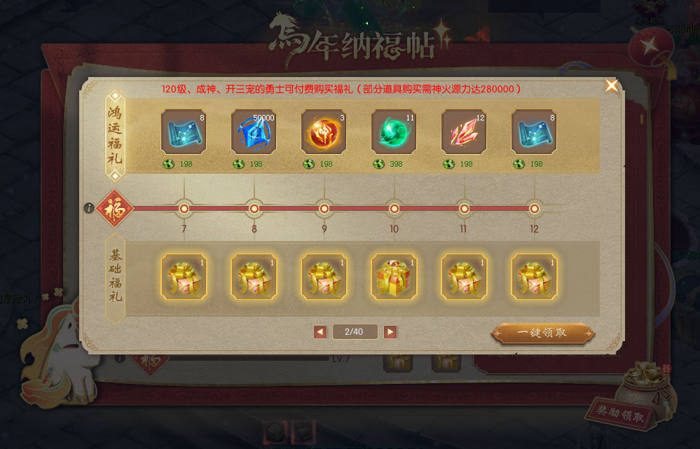 人物等级达到120级、角色成神且能够驾驭三宠的勇士,可消耗魔石解锁福礼——