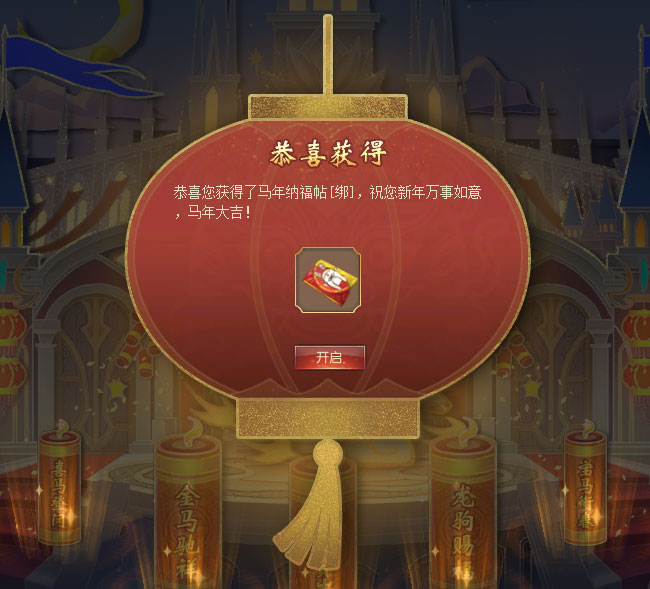 此外还有3级珍兽灵药【绑】、100级圣日之砂【绑】、31.5星XO礼包【绑】等鸿运福礼,部分鸿运福礼需要神火源力达到280000才可购买。 马年纳福帖升级奖励——