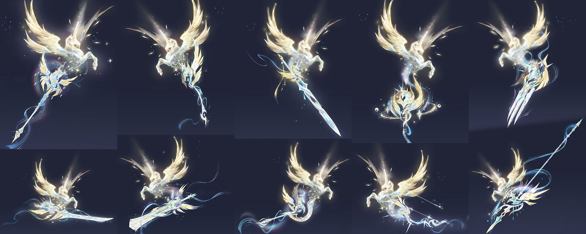 说明:【2026年情缘嘉年华】圣洁高傲的天马在青空中驰骋,悠然舒展的鎏金羽翼拂过云海之时,洒落如梦璀璨的澄明星光,在辽阔苍穹留下象征纯真与希望的光之路。当溯梦辉光与使用者的武器融为一体时,武器的外观将焕发出璀璨如梦的华光。