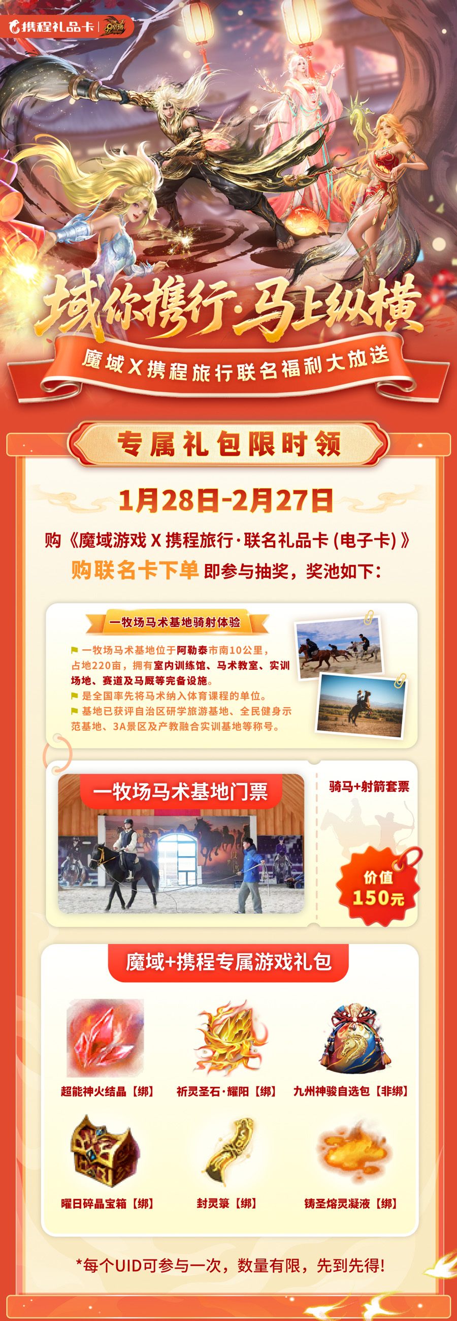 本次合作特别定制 “魔域×携程”主题联名电子礼品卡,最低充值100元即可参与,多重好礼等你解锁: