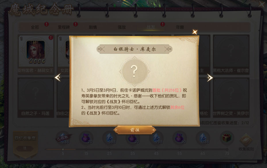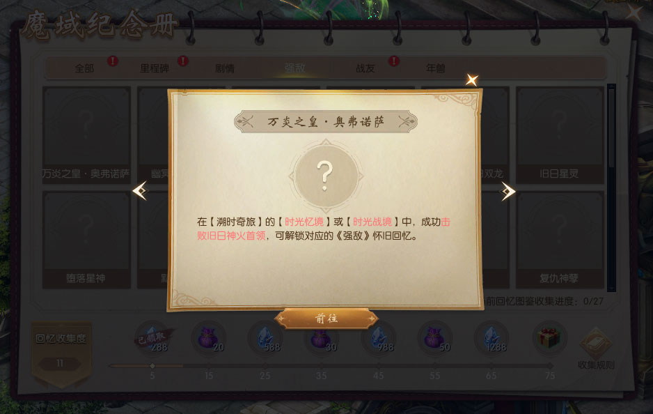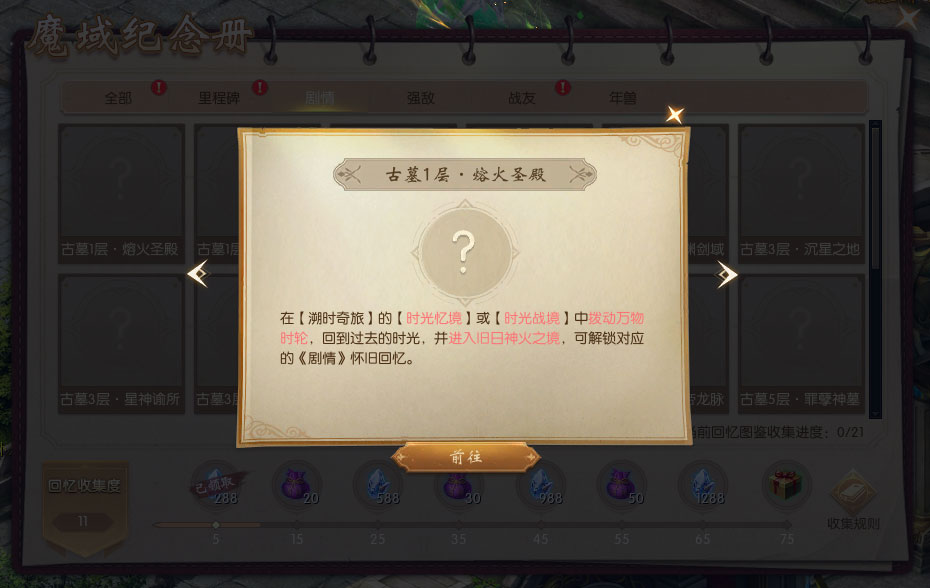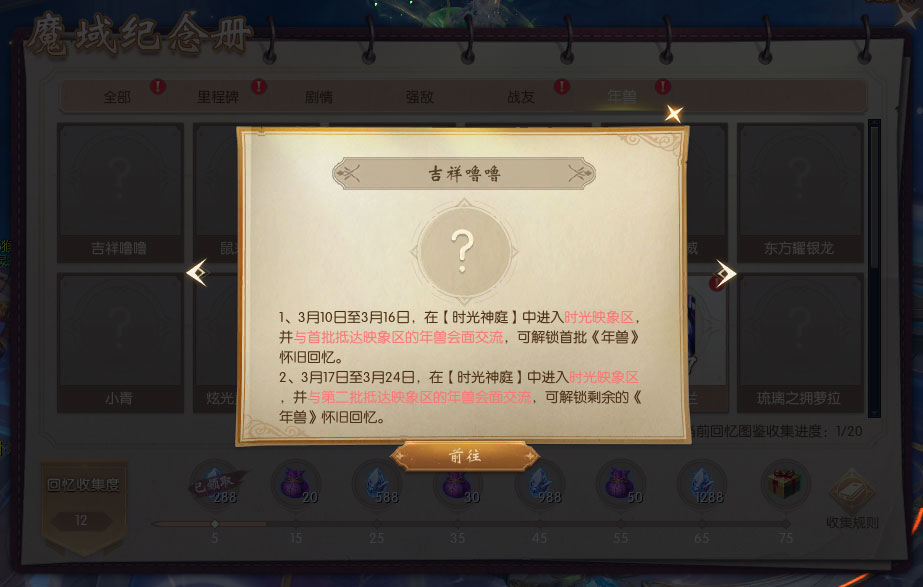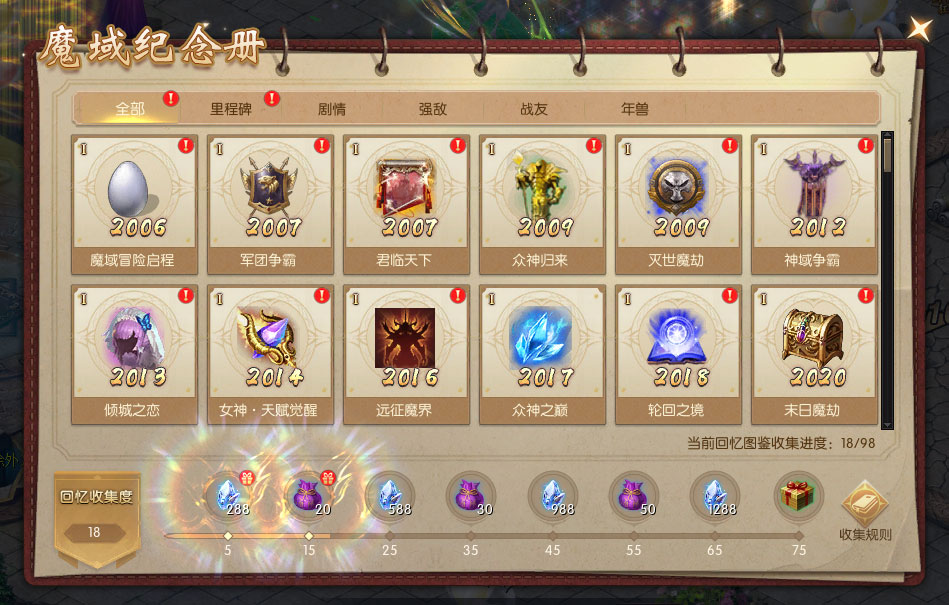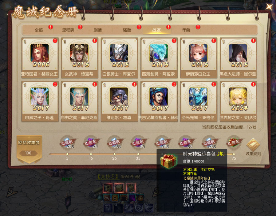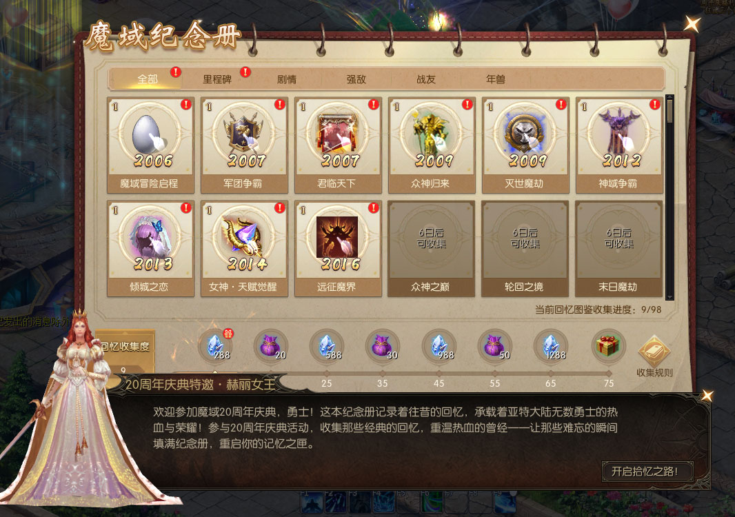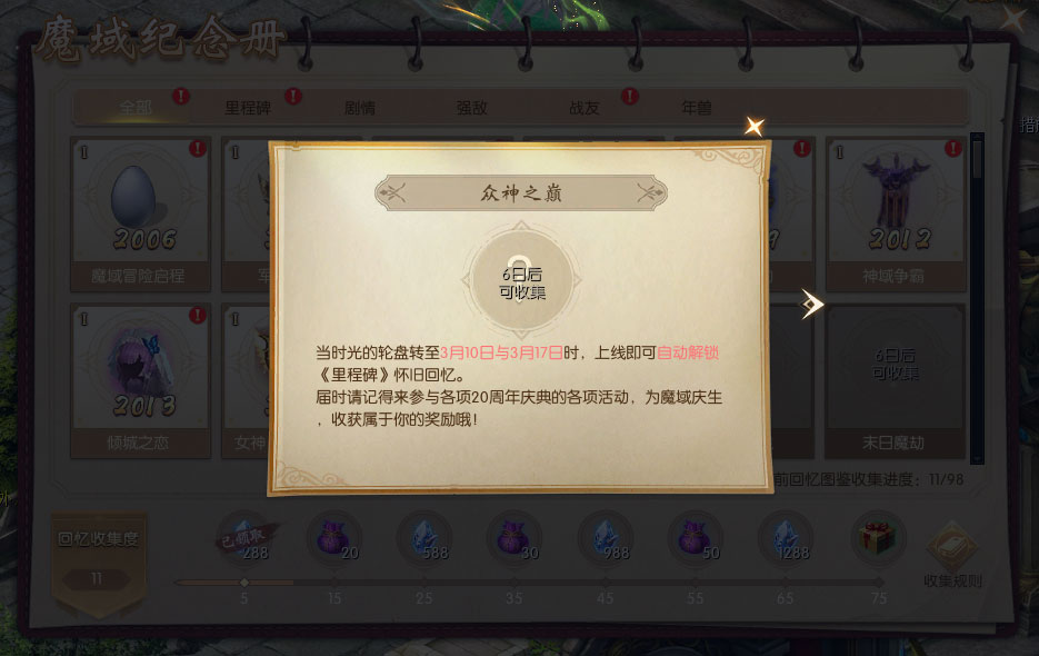 1、活动期间首次开启魔域20周年庆典邀请函,即可获得【魔域20周年纪念册】。纪念册中共有98个“回忆图鉴”等待解锁,解锁回忆图鉴达一定数量,即可获得时光晶石【绑】等好礼。 2、“回忆图鉴”分为里程碑、剧情、强敌、战友、年兽5大主题,在魔域20周年庆典活动期间上线,参与“时光之礼”“溯时奇旅”“时光映象”活动,即可解锁对应主题回忆图鉴。 |