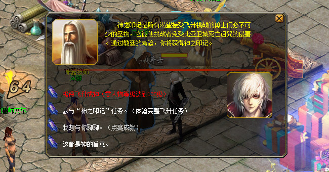通过亚卫城内的真神飞升挑战,是每一位强者修炼之路上必经的目标——唯有通过飞升挑战,才可掌握神力,令自己的战斗水平迈入更高的境界。 想要开启极速飞升成神挑战,人物等级必须达到130级,且携带1只40星以上的未成神幻兽。满足条件后,你找到黑袍大法师·崔尔登,询问圣物“神之印记”相关事宜。 传说想顺利通过飞升挑战,圣物“神之印记”必不可少——它将免除挑战者进入比亚卫城之后所遭受到的死亡诅咒。