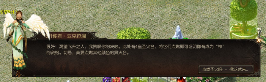 1、前往卡诺萨城(424,137)处寻找黑袍大法师·崔尔登,可直接跳过“神之印记”飞升前置任务,进入比亚卫城。 2、进入比亚卫城后,可跳过五大神殿挑战,直接前往真神飞升台,通过燃火试炼,完成神化仪式,飞升为神。 |