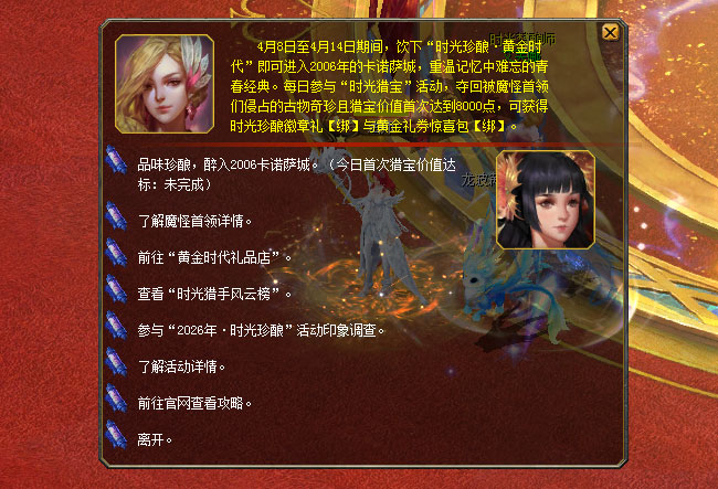 1、活动期间,饮下“时光珍酿·黄金时代”即可进入2006年的卡诺萨城,换上2006年的复古经典装扮,重温记忆中难忘的青春岁月。 2、每日参与“时光猎宝”活动,夺回被魔怪首领们侵占的古物奇珍且猎宝价值首次达到8000点,可获得时光珍酿徽章礼【绑】与黄金礼券惊喜包【绑】。 |