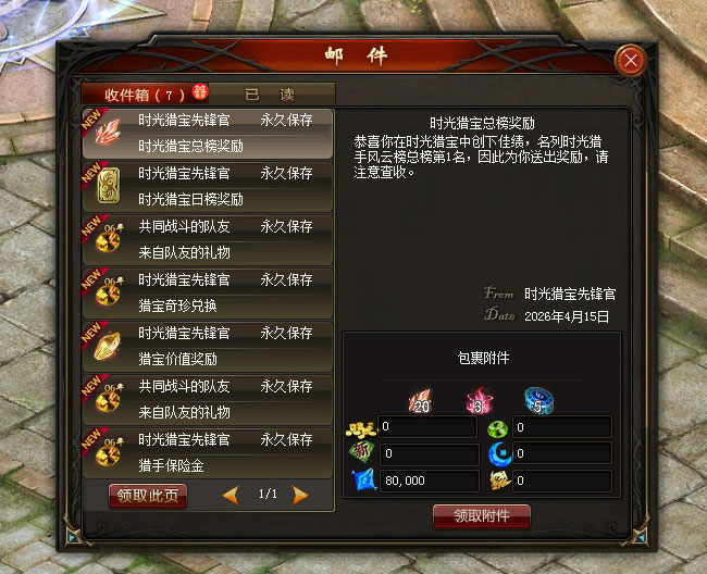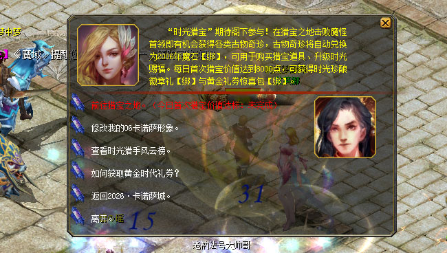 安全撤离后,本次获得的古物奇珍将自动兑换为对应价值的2006年魔石【绑】。 注:在限时时间内未能安全撤离或在猎宝之地阵亡均视为撤离失败,身上携带的古物奇珍与猎宝道具将全部丢失。 离开猎宝之地后,时光猎宝先锋官告诉你,每日首次安全撤离、每日单次安全撤离时获得的猎宝价值达到对应目标、活动期间累计获得的猎宝价值达到对应目标等均可获得对应奖励,不仅可获得2006年魔石【绑】,还有机会获得大量黄金时代礼券【绑】,在黄金时代礼品店中换取珍贵奖励! 单次挑战中安全撤离获得的猎宝价值还可助力你竞逐时光猎宝日榜与总榜排名,赢取豪华排名奖励!