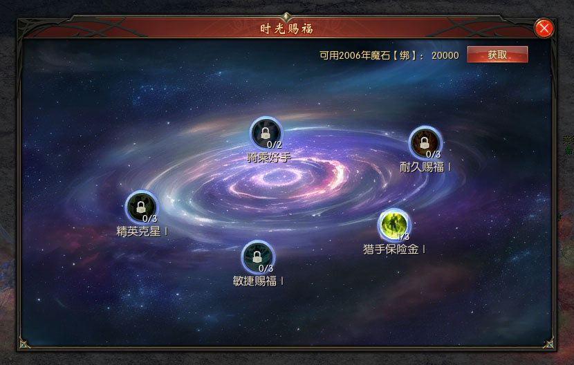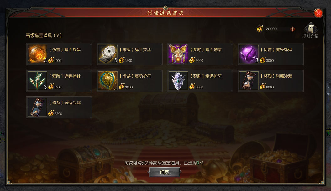 【时光赐福】 只要你身处猎宝之地,就能获得时光赐福的庇佑。消耗2006年魔石【绑】还可提升赐福等级与效果。 1、骑乘好手:令你在猎宝之地内能骑乘幻兽奔跑或飞行,快速移动。 2、耐久赐福:增加你在猎宝之地内的探索限时,并使猩红毒雾出现的时间延后。 3、精英克星:令你在猎宝之地中对魔怪首领造成的伤害增加。 4、猎手保险金:若你撤离失败,将会获得此前损失的猎宝价值的一部分作为猎手保险金。 5、敏捷赐福:令你在猎宝之地内可使用“闪现”技能,可累积2次。 【猎宝道具】 与升级之后持续生效的时光赐福不同,猎宝道具大多只能在单次挑战中生效,但他们大多具有极为神奇的效果,且价格相对低廉。 猎宝道具分为高级猎宝道具与低级猎宝道具。每次挑战时,最多可选择购买3种不同的高级猎宝道具,每种低级猎宝道具均可购买1份。未被使用的猎宝道具在安全撤离时将会自动兑换为2006年魔石【绑】,其中部分道具在进入猎宝之地时将会自动生效。 注:不同道具组合可产生不同效果,请多多尝试,找到最适合自己的组合。 你在猎宝之地内,有机会获得各种各样的古物奇珍,其中奇珍·八荒火莲、奇珍·幽冥龙炎与奇珍·创世雷炎的猎宝价值分别为2000、4000与6000;普通古物的猎宝价值为20-50,上品古物的猎宝价值为480-640,精品古物的猎宝价值为660-850。